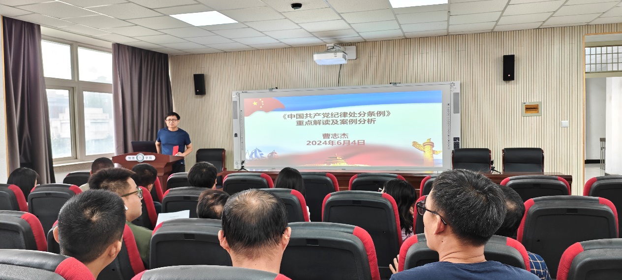 2024年6月4日,线上老虎机 全体党员在博远楼321会议室开展党纪学习教育书记讲党课活动。本次党课由线上老虎机 党总支副书记曹志杰同志主讲,题目是“《中国共产党纪律处分条例》重点解读及案例分析”。结合《中国共产党纪律处分条例》,曹志杰同志强调党的纪律是党的各级组织和全体党员必须遵守的行为规则。在日常工作中,始终牢记自己的第一身份是共产党员,坚定信念,明确责任,以铁的纪律护航线上老虎机 高质量发展