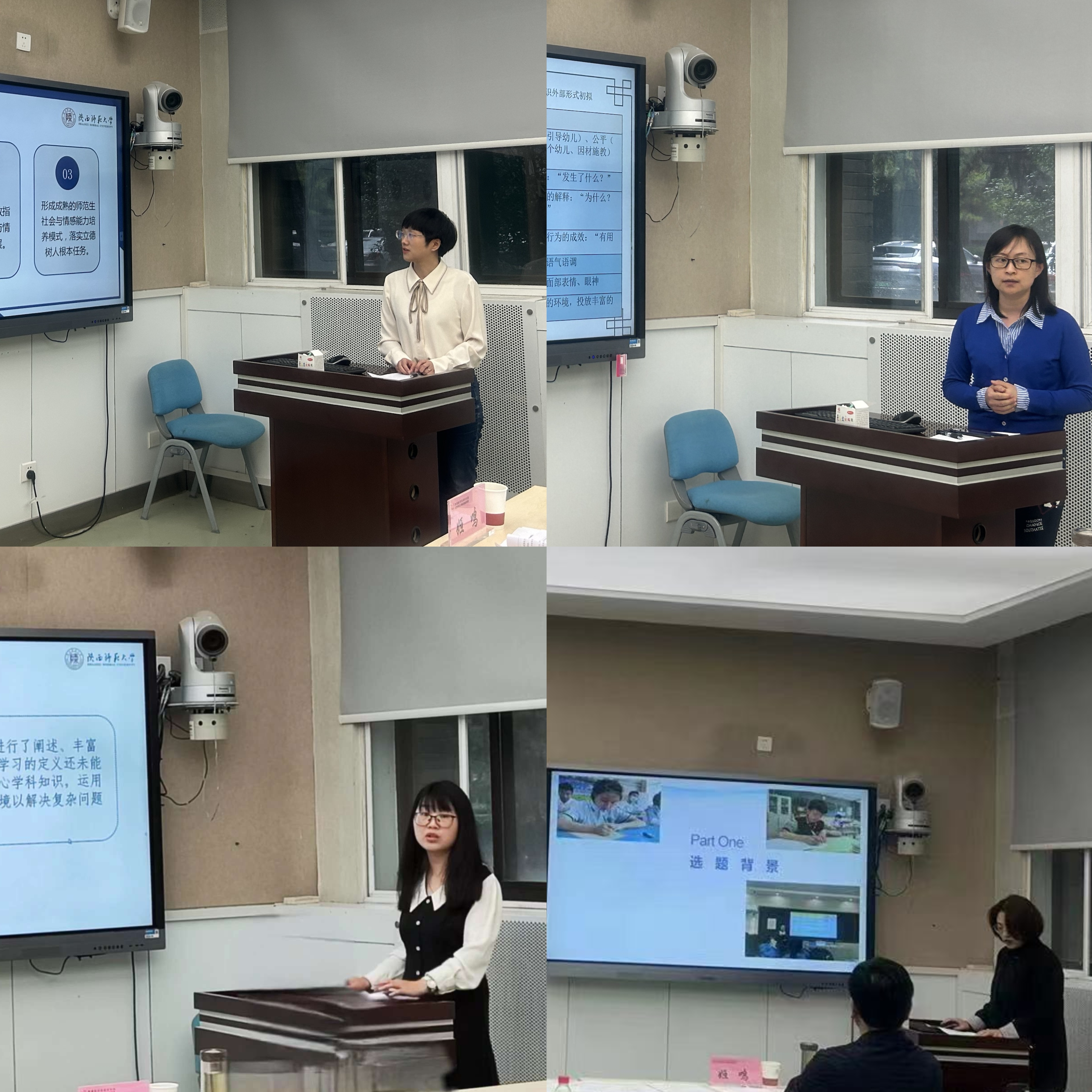 2022年研究生创新基金资助项目博士生一般项目负责人辛爽、蔡李娜、唐科和葛晓穗四位教育博士生,分别汇报了《思维地图在聋生英语课堂教学中的实践探究》《指向核心素养的中学英语课堂深度学习路径研究》《立德树人视域下师范生社会与情感能力培养研究》《基于师幼互动的幼儿教师实践性知识发展研究》课题的研究设计和思路。