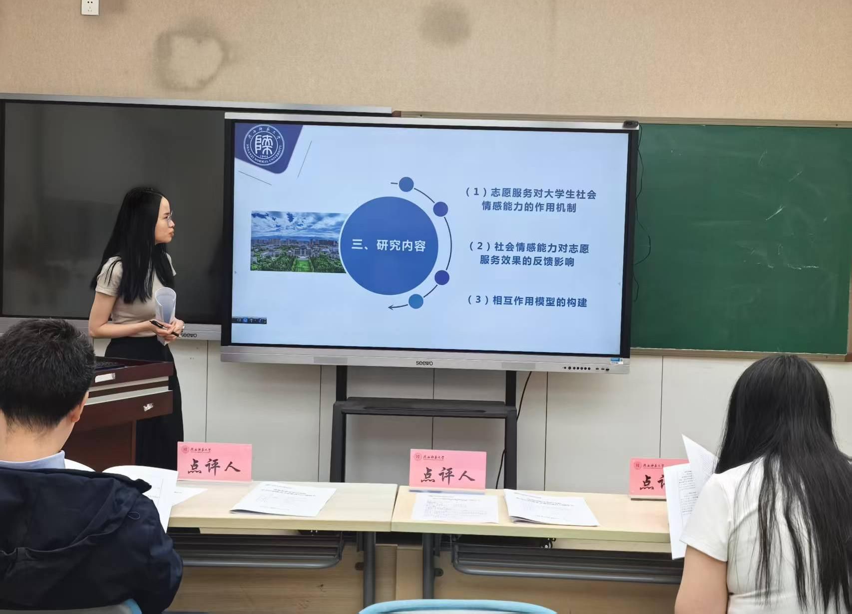 会上,王紫蓉、柳晓洁、姜玲音、王岚四位项目负责人依次对《大学生志愿服务行为与社会情感能力的相互作用机制研究》《青少年日常烦心事对人生意义感的影响机制及干预》《美育视域下“优师计划”师范生审美素养的影响因素及提升策略研究》《跨学科融合教学促进学生全面发展的实证研究》四个项目进行开题汇报,从选题背景和意义、国内外研究现状、研究的价值、研究思路与设计、预期成果等方面进行全面阐述。