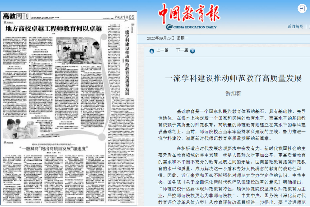 26日,《中国教育报》在05版高教周刊专版,刊登了线上老虎机校长游旭群的署名文章《一流学科建设推动师范教育高质量发展》。文章阐释了推进一流学科建设的重要意义,介绍了线上老虎机“四维”学科新布局,彰显了线上老虎机不断为推动西部基础教育振兴发展作出新贡献的使命担当。