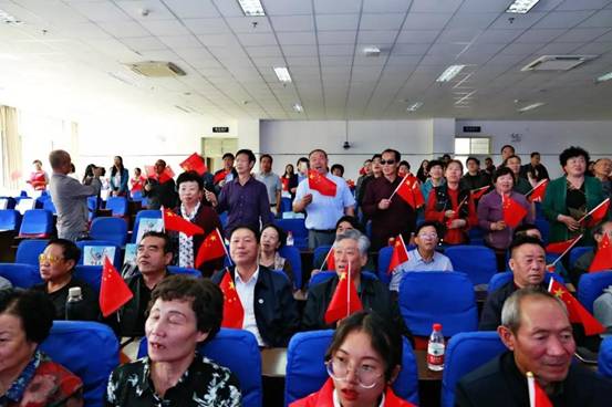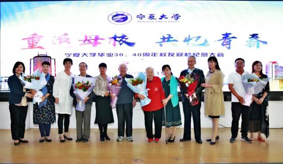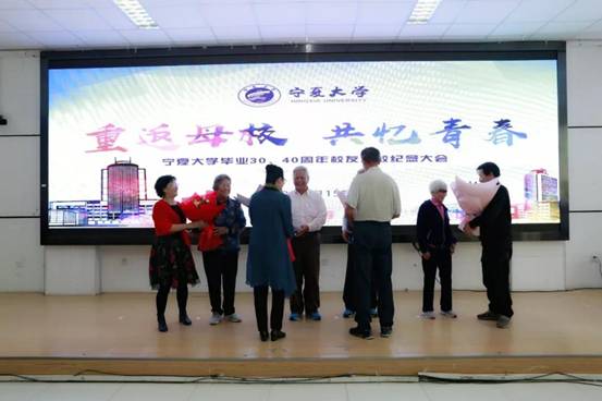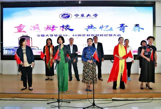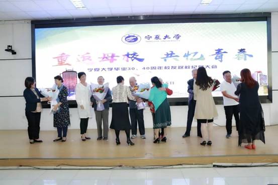 会议最后,返校班级代表为恩师献花。原银川师专86级音乐系校友带领与会师生合唱《我和我的祖国》、《年轻的朋友来相会》,共同祝福祖国更加繁荣昌盛。纪念大会在大家的合唱声中落下帷幕。
