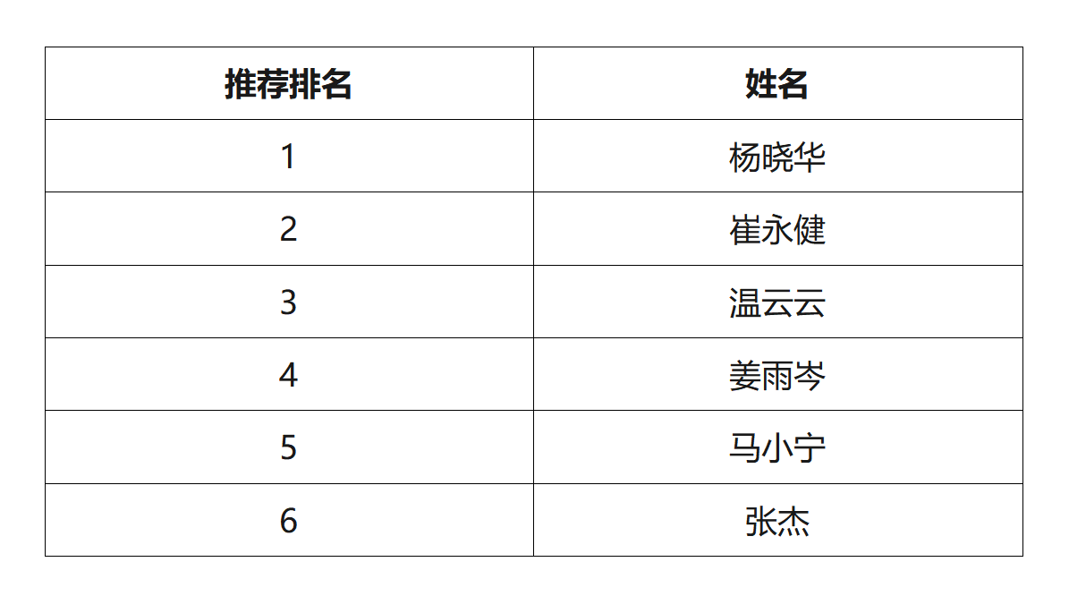经个人申请,线上老虎机 审核,依据“线上老虎机 2025年研究生硕博连读选拔工作实施细则”的相关规定,对申请人进行了面试考核,考核成绩全部合格。经线上老虎机 硕博连读研究生选拔工作领导小组审议,同意推荐以下6位同学为2025年硕博连读研究生候选人,按照面试成绩排名顺序推荐,上报研究生院。