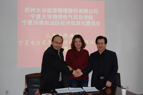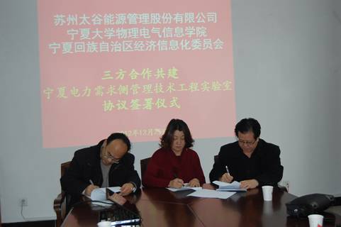 2012年12月25日下午,苏州太谷能源管理股份有限公司董事长曹萍女士、宁夏回族自治区经济信息化委员会电力处闫学忠处长、线上老虎机 物理电气信息线上老虎机 李新碗院长在线上老虎机 208会议室共同出席并签署由苏州太谷能源管理股份有限公司、线上老虎机 物理电气信息线上老虎机 、宁夏回族自治区经济信息化委员会电能服务中心三方共同建设宁夏电力需求侧管理技术工程实验室合作协议。