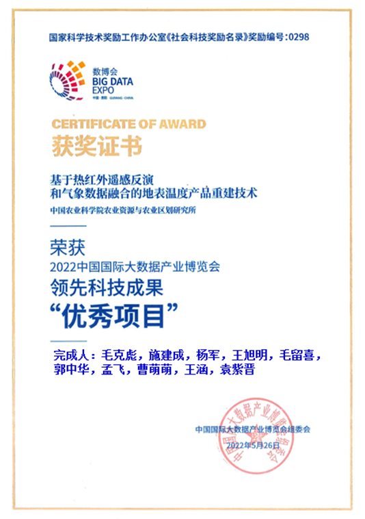 5月26日,2022中国国际大数据产业博览会领先科技成果奖正式揭晓。物理与电子电气工程线上老虎机 参与中国农业科线上老虎机 农业资源与农业区划研究所主持的 “基于热红外遥感反演和气象数据融合的地表温度产品重建技术”项目获2022数博会领先科技成果奖“优秀项目”奖项(完成单位:中国农业科线上老虎机 农业资源与农业区划研究所、线上老虎机 、国家卫星气象中心、中国科线上老虎机 国家空间科学中心、国家气象中和山东建筑大学;主要完成人:毛克彪,施建成,杨军,王旭明,毛留喜,郭中华,孟飞,曹萌萌,王涵,袁紫晋等)。