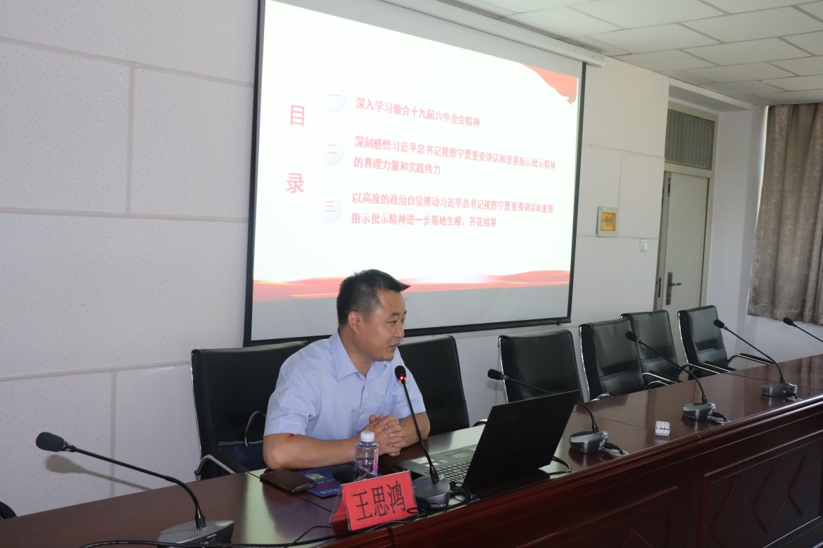 王思鸿从“深入学习领会十九届六中全会精神”“深刻感悟习近平总书记视察宁夏重要讲话和重要指示批示精神的真理力量和实践伟力”“以高度的政治自觉推动习近平总书记视察宁夏重要讲话和重要指示批示精神进一步落地生根、开花结果”三个方面对习近平总书记视察宁夏重要讲话精神进行了解读。