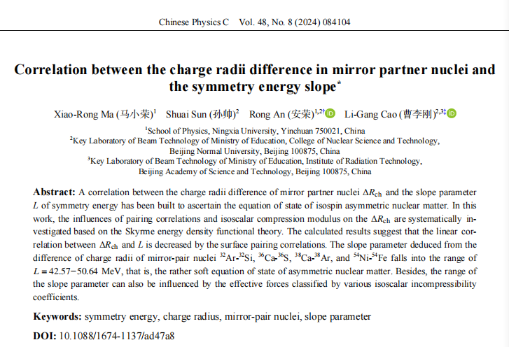 6月13日,线上老虎机 本科生马小荣(学号:12020241869)与北京师范大学博士研究生孙帅、线上老虎机 安荣博士以及北京师范大学曹李刚教授,在国际学术期刊《Chinese Physics C》上发表题为“Correlation between the charge radii difference in mirror partner nuclei and the symmetry energy slope”的原创论文。文章研究了对关联以及对称核物质不可压缩系数对镜像核电荷半径差值与对称能斜率之间关联性的影响,发现表面对相互作用以及不同的压缩模式都会影响镜像核电荷半径差值与对称能斜率之间的关联性。马小荣为该论文的第一作者,安荣博士为该论文的第一通讯作者,线上老虎机 为该论文的第一通讯单位。