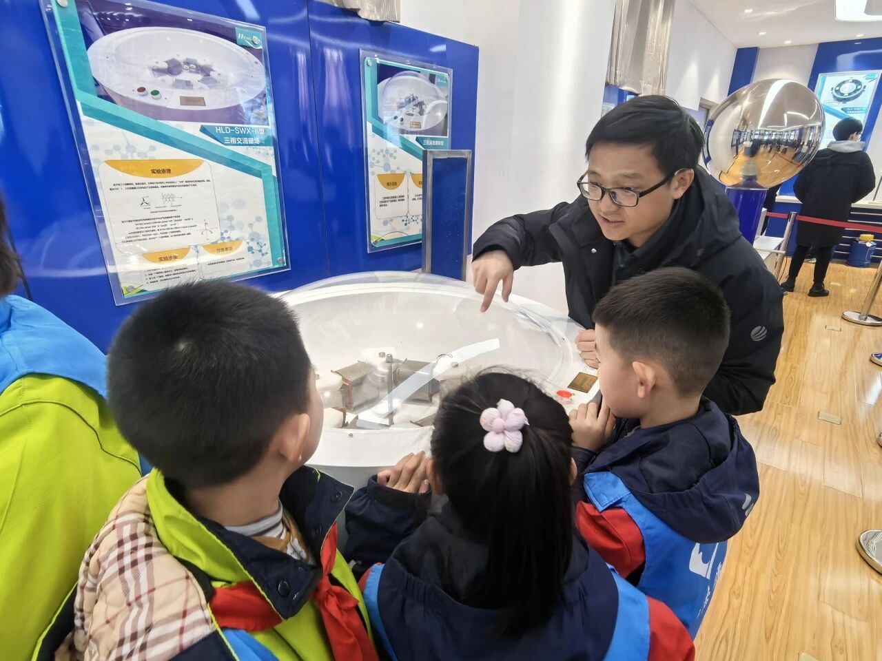抵达实验中心后,在微科普团队的有序引导下,同学们分成三组分别前往电磁学、光学、力学三大主题实验室参观学习,团队结合小学生认知特点精选趣味直观的实验项目,将抽象物理原理转化为可感体验:电磁学实验室中,磁悬浮列车模型、静电发生器成焦点,志愿者演示磁场作用力、静电吸纸屑等现象,同学们兴奋围拢并尝试操作;光学实验室里,“被折断的筷子”“重现的硬币”等实验吸引同学们目光,志愿者讲解光的折射、反射原理,激光形成的绚丽干涉条纹更让大家驻足惊叹、主动求教;力学实验室里,滚摆、共振演示仪等设备直观呈现力学原理,志愿者结合生活实例讲解重力、弹力等知识,引导同学们俯身观察、认真记录,深切感受生活中的物理学问。