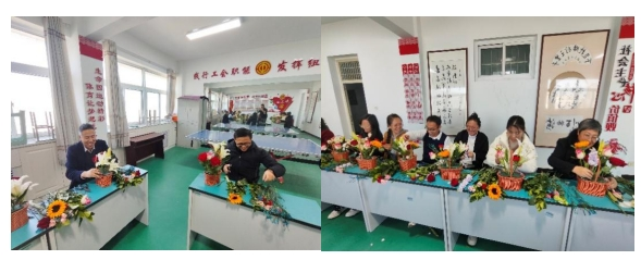 讲解结束后,插花创作正式开始。女教职工们热情高涨、兴致盎然,纷纷化身“花艺设计师”,手持花枝精心修剪、巧妙搭配。她们将对生活的热爱、对美的理解融入指尖,兼顾对称平衡与创意灵动,时而轻声探讨搭配技巧,时而分享创作心得,现场欢声笑语不断,温馨又热闹。一朵朵鲜花在大家的巧手中错落有致地绽放,一束束独具匠心的花艺作品逐渐成型,或清雅简约,或热烈奔放,既彰显了物理学科的对称之美,又饱含着对生活的美好期许。