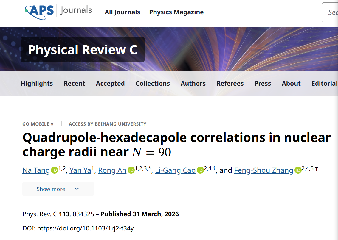 2026年3月31日,线上老虎机 理论物理组青年教师唐娜博士和安荣博士与北京师范大学曹李刚教授和张丰收教授,在美国物理学会权威期刊《Physical Review C》上发表题为《Quadrupole-hexadecapole correlations in nuclear charge radii near N = 90》的原创性论文。文章通过同时约束四极形变和十六极形变的方法,系统描述了中子数N=90附近原子核电荷半径的演化趋势。文中指出,在N=90处原子核电荷半径会发生形状相变,同时四极矩和十六极矩之间的强耦合行为也会影响电荷半径的数值大小。唐娜博士是该论文的第一作者,2024级硕士研究生雅燕(学号:12024130700)为该论文的第二作者,安荣博士是该论文的第一通讯作者,线上老虎机 为该论文的第一完成单位。