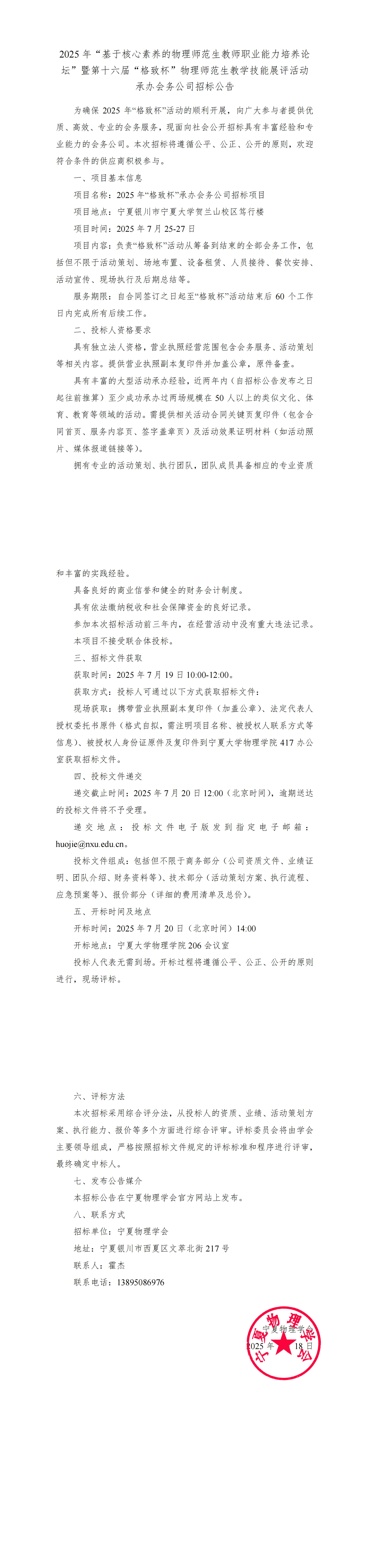 2025年“基于核心素养的物理师范生教师职业能力培养论坛”暨第十六届“格致杯”物理师范生教学技能展评活动承办会务公司招标公告