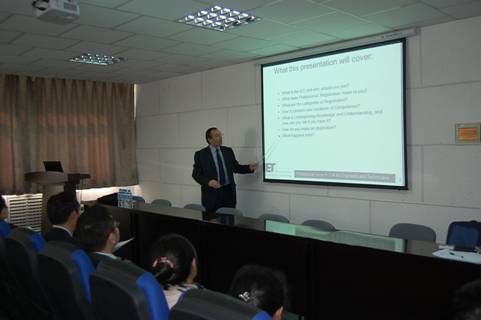 2012年10月21日下午,英国工程技术学会皇家注册工程师、资深会士,现任IET职业发展部门经理Dick Bacon先生在物理电气信息线上老虎机 学术报告厅217室,为线上老虎机 相关 专业的研究生和部分老师做学术报告,报告会由车进副院长...